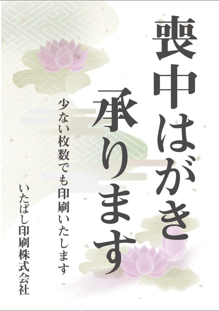 喪中ハガキ承ります。印刷枚数はご希望の数にて少なくても大丈夫です。見本もございますのでお気軽にお問い合わせください。