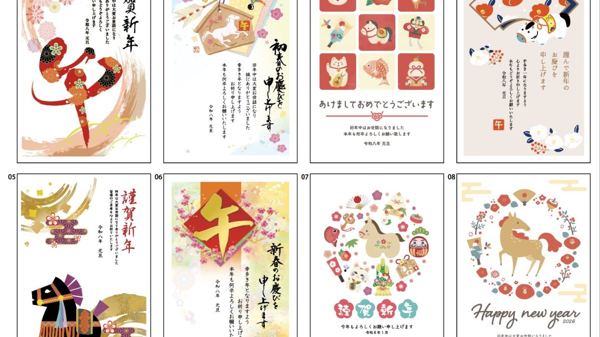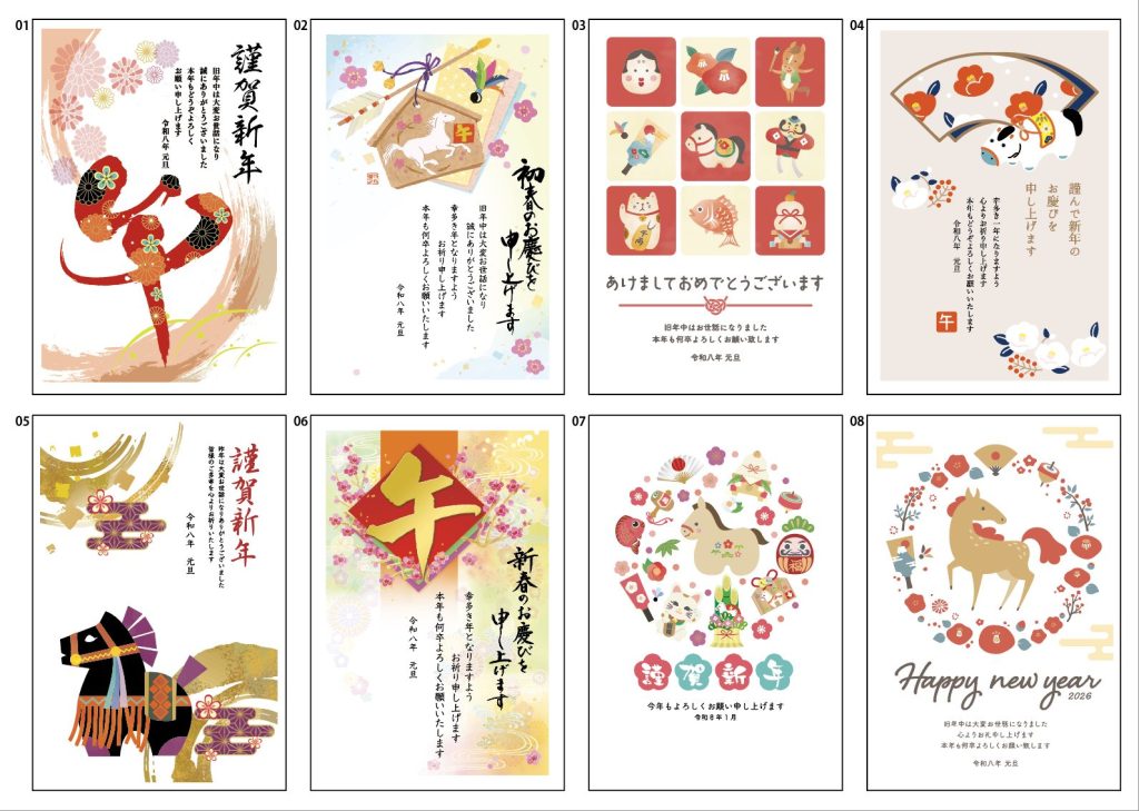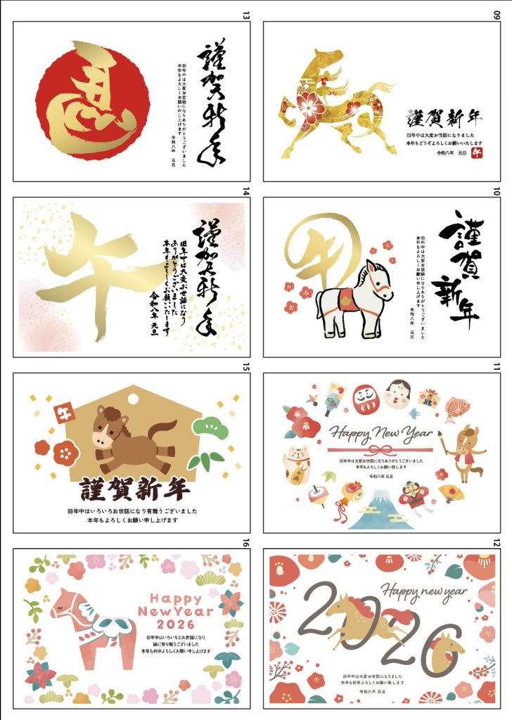 年賀状印刷承ります。 2026年度の年賀はがきの印刷ならいたばし印刷にお任せください。オリジナルのデザインから見本の中よりお選びいただき印刷いたします。また年賀状も当社でご用意も出来ます!